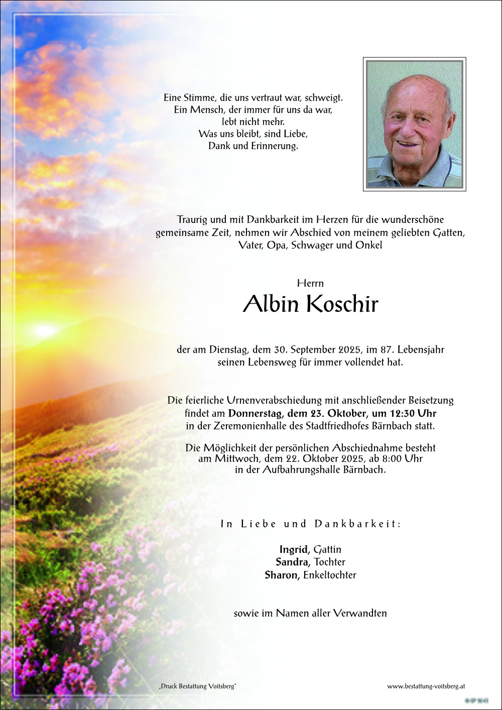Eine letzte gute Reise. Ruhe in Frieden Albin.Dir liebe Ingrid unser aufrichtiges Beileid. Christa und Fredi.