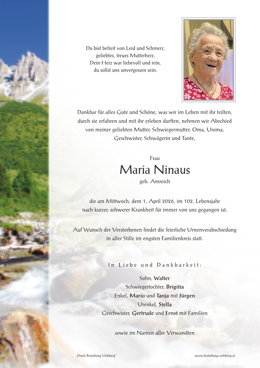 Die Nachricht vom Tod unseres Langjährigen Naturfreunde Mitgliedes Maria Ninaus die am 1.April 2026 im Alter von 101 Jahren erfüllt uns mit tiefer Trauer. Mimi, wie sie von den Freunden der Naturfreunde Stammtischrunde genannt wurde war ein geselliger und freundlicher Mensch. Bei Geburtstagsfeiern in der Stammtischrunde war sie die erste welche zum Singen animierte. Auf deinen Letzten Weg ein herzliches „Berg frei“ und mögest du in Frieden ruhen.