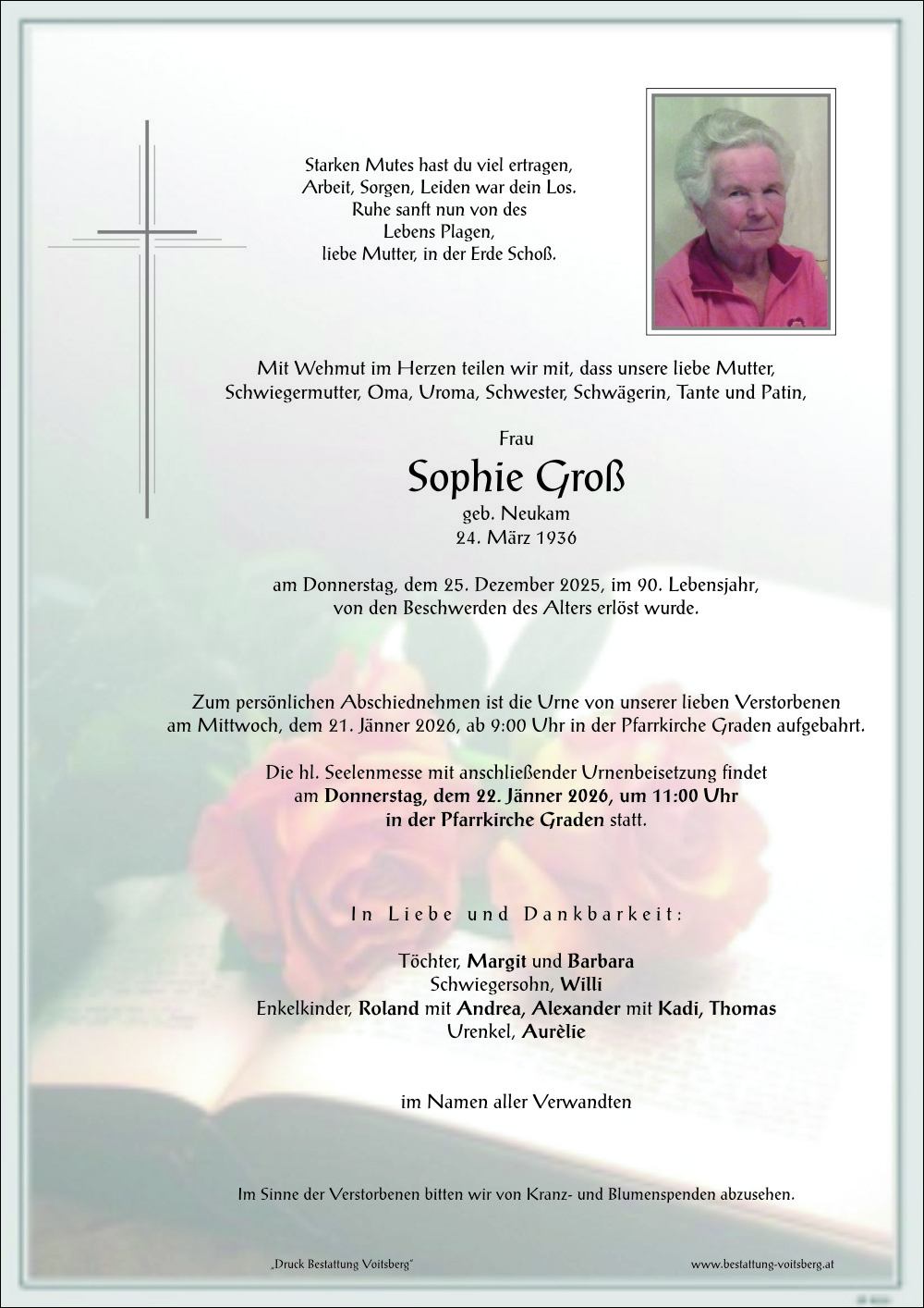 Liebe Schwester Sophie, a Lichterl soll dich hinüber begleiten in deine neue Heimat! Ruhe sanft in Gottes Frieden! Du wirst immer unter uns sein. Liebe Margit und liebe Barbara mit euren Fam. gilt unsere innigste Anteilnahme.